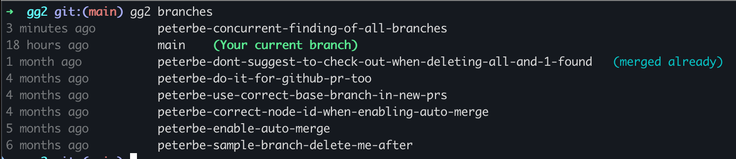 gg2 is a command line tool for doing things with Git branches, faster. One of the convenient commands is gg2 branches.